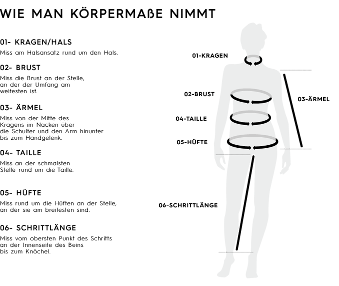 | GRÖßE | HÖHE (cm) | GEWICHT (kg) | BRUST (cm) | TAILLE (cm) | HÜFTE (cm) | KRAGEN (cm) | SCHRITTLÄNGE (cm) |